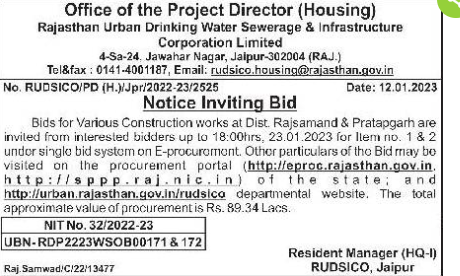 Tender for Construction works at Dist. Rajsamand & Pratapgarh are invited from interested bidders up to 18:00hrs,