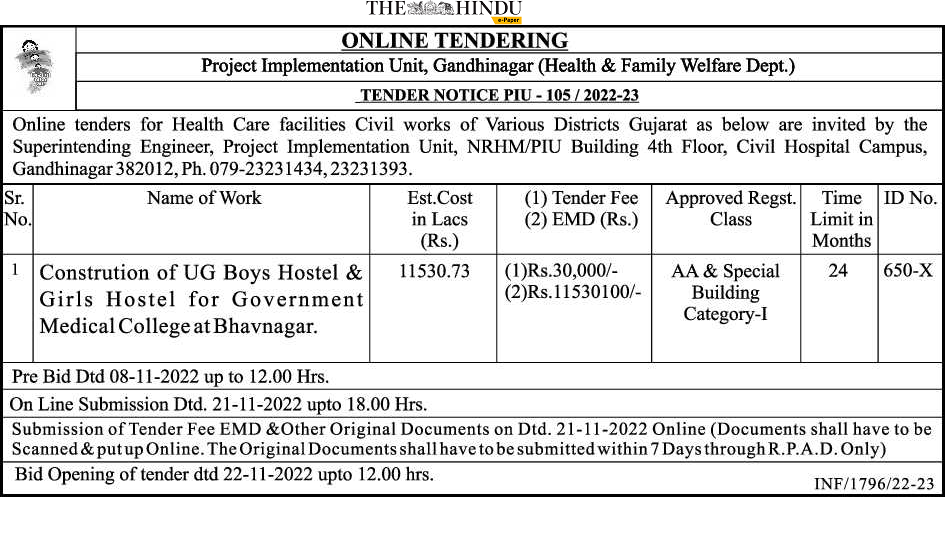 Tender for Constrution of UG Boys Hostel & Girls Hostel for Government Medical College