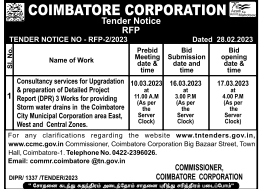 Tender for Consultancy services for Upgradation & preparation of Detailed Project Report (DPR) 3 Works for providing Storm water drains in the Coimbatore City Municipal Corporation area East, West and Central Zones.