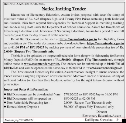 Tender for containing both Technical and Financial bids from reputed firms/agencies for Technical Support in recruiting teaching and non-teaching staff under the Department of School Education, Assam