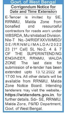 Tender for contractors for roads work under WBSRDA, Murshidabad Division. Nle-T No.-34/RIDFXXVIII/MSD/ SE/RRNMU/MALDA/2022 23 [1st Call] SL No-2, 4 & 7 OF THE SUPERINTENDING ENGINEER, RRNMU, MALDA