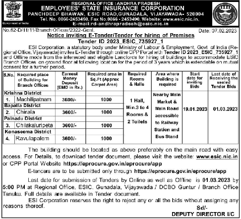 Tender for CPP Portal with Tender ID 2023 ESIC 735927 1 ard Offline mode from the interested and eligible Landlords for hiring of buildings to accommodate ESIC Branch Offices on ground floor al following locat on for the period of 3 years which is extendable on mutual consent for a further period.