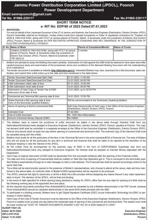 Tender for Creation of 8X25 & 1X63 KVA S/Stn. along with HT/LT at various places of Poonch, Mandi & Surankote under the jurisdiction of Electric Sub Division JPDCL Poonch, Mandi & Surankote under TSP-2022-23