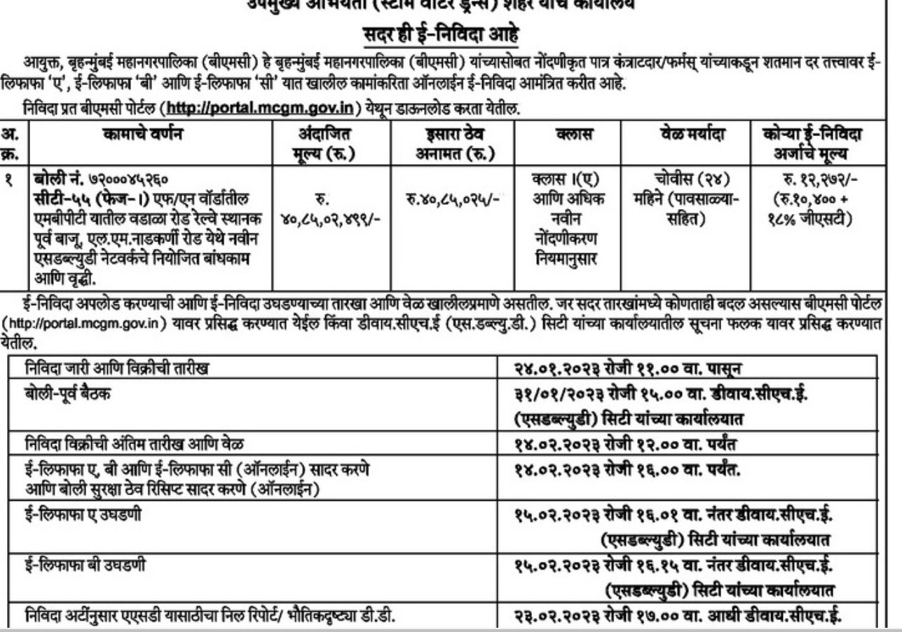 Tender for CT-55 (Phase-1) in F / N Ward | Wadala Road Railway Station East Side of MBPT, L. M. New at Nadkarni Road | Planned construction and enhancement of SW network.