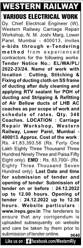 Tender for Cutting, Stitching & Fixing of ducting cloth on SS frame of ducting after duly cleaning and applying RTV sealant for POH of ducting and Stripping & Refitting of Air Bellow ducts of LHB AC coaches as per scope of work