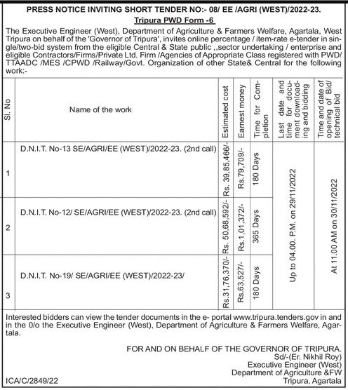 Tender for D.N.I.T. No-13 SE/AGRI/EE (WEST)/2022-23. (2nd call)