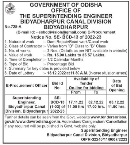 Tender for Dam Repair/Road work/Canal work
