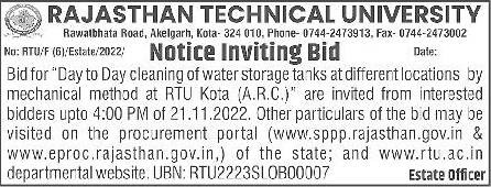 Tender for Day to Day cleaning of water storage tanks at different locations by mechanical method at RTU Kota (A.R.C.)”