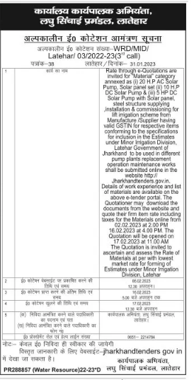Tender for ‘DC Solar Pump & () 5 HP DC Solar Pump with Solar panel, steel structure cture supplying instalaion & commissioning for scheme from Manufacture nufacture (Supplier having valid GSTIN for respective items conforming to the specifications inclusion in the B Estimates under Minor Imigation Division, Latehar Goverment of Jharkhand to be u used in different pump plants replacement operation maintenance works