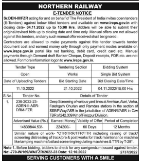 Tender for Deep Screening of various yard lines at Amritsar, Atari, Verka, Fatehgarh Churian and Ramdas stations in the section of SSE/PWay ASR in the jurisdiction of ADENASR in C/w TBR of 242.339 Km of Firozpur Division.