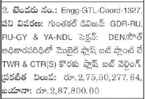 Guntakal Division: GDR-RU, “RU-GY & YA-NDL Section: DEN/South Jurisdiction for TWR & CTR(S) by Mobile Flash Butt Plant Flash Butt Welding