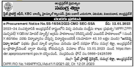 Tender for Departments of the State of Andhra Pradesh for the year 2023-24 Aggregate Shiksha for supply of school bags and shoes under “Jagananna Vidya Kanuka”