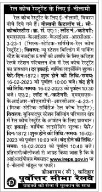 E-Auction for Rail Coach Restaurant, details are given below. Auction Catalog No. C- Kochrestaura no. From. AA1: Lot no. /Category: IR K IR of MSS- RCR- 3-23-1 (MISC STATIC SERVICES RAIL COACH RESTAURANT): Description: Rail Coach Restaurant in Katihar Railway Station operational area for a period of 5 years near Parking Stand in New Station Building Provision of unit rate annual licensing fee. Round Day 1872 Opening Date/Time: 16-02-2023 at 10:00 AM Closing Date/Time: 16-02-2023 at 10:30 AM AA2 LOT NO. / Category: MSS- KIR BNDP RCR 4-23-1 (MISS STATIC SERVICES RAIL COACH RESTAURANT);
