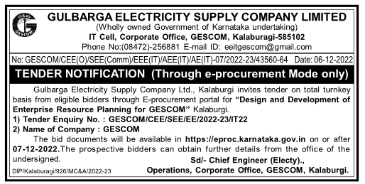 Tender for “Design and Development of Enterprise Resource Planning for GESCOM” Kalaburgi.