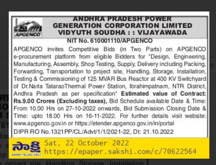 Tender for “Design, Engineering, Manufacturing, Assembly, Shop Testing, Supply, Delivery including Packing, Forwarding, Transportation to project site, Handling, Storage, Installation, Testing & Commissioning of 125 MVAR Bus Reactor at 400 KV Switchyard of Dr.Narla TataraoThermal Power Station, Ibrahimpatnam, NTR District, Andhra Pradesh as per specification