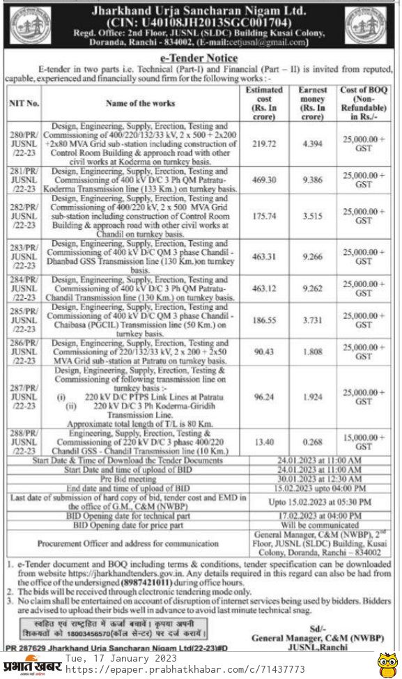 Tender for Design, Engineering, Supply, Erection, Testing and Commissioning of 400/220/132/33 kV, 2 x 500+2×200 +2×80 MVA Grid sub-station including construction of Control Room Building & approach road with other civil works at Koderma on turnkey basis.