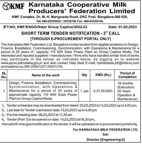 Tender for Design, Finance, Installation, Commissioning. Synchronization, with Operations & Maintenance for a period of 25 years of approximate capacity 110 MW Solar Power Plant on Group Captive Mode.