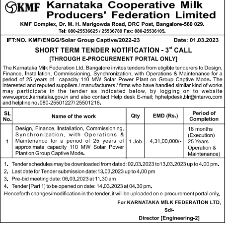 Tender for Design, Finance, Installation, Commissioning. Synchronization, with Operations & Maintenance for a period of 25 years of approximate capacity 110 MW Solar Power Planton Group Captive Mode.