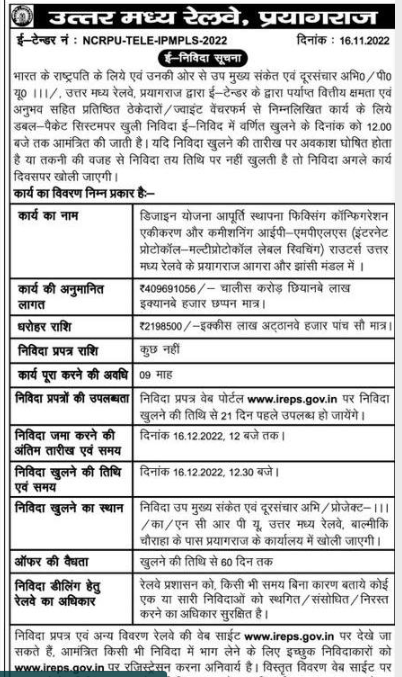 Tender for Design, Planning, Supply, Installation, Fixing, Configuration, Integration and Commissioning of IP-MPLS (Internet Protocol-Multiprotocol Label Switching) Routers at Prayagraj, Agra and Jhansi Divisions of North Central Railway.