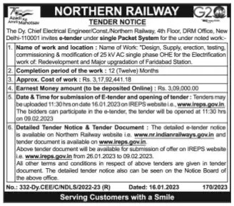 Tender for “Design, Supply, erection, testing. commissioning & modification of 25 kV AC single phase OHE for the Electrification work of Redevelopment and Major upgradation of Faridabad Station.
