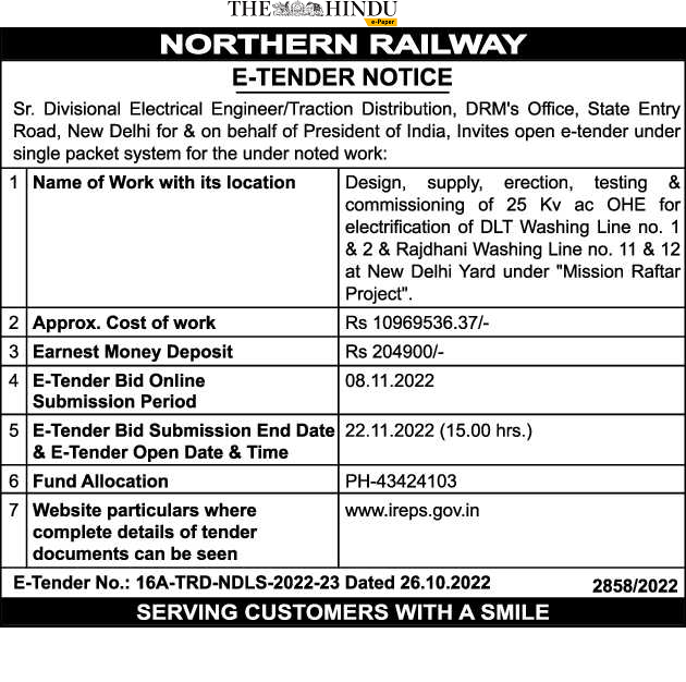 Design, supply, erection, testing & commissioning of 25 Kv ac OHE for electrification of DLT Washing Line no. 1 & 2 & Rajdhani Washing Line no. 11 & 12 at New Delhi Yard under “Mission Raftar Project”.