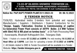 Tender for Design, Supply, Fabrication, Erection & Commissioning of captive Co-Generation Power Plant consists of 30TPH Boiler, 2.5 MW Turbine with 50m3 RO & MB plant on turnkey basis