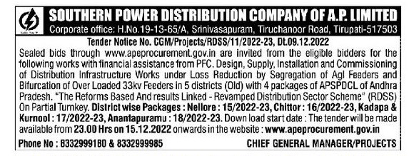 Tender for Design, Supply, Installation and Commissioning of Distribution Infrastructure Works under Loss Reduction by Segregation of Agl Feeders and Bifurcation of Over Loaded 33kv Feeders in 5 districts (Old) with 4 packages of APSPDCL of Andhra Pradesh.