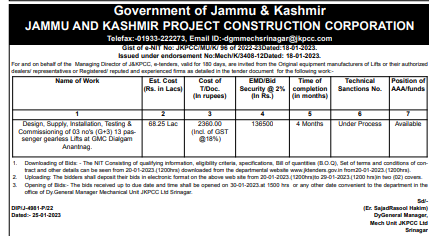 Design, Supply, Installation, Testing & Commissioning of 03 no’s (G+3) 13 passenger gearless Lifts at GMC Dialgam Anantnag.