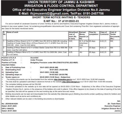 Tender for Desilting of Biaspur Minor of D-11 of MRC from RD 0 to 5000 Mtr. (Advt. Cost Rs 4.03 lakhs)