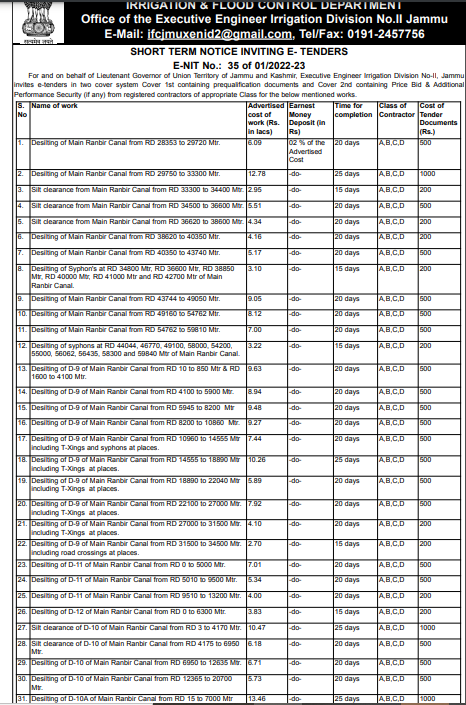 tender for Desiting of D-9 of Main Ranbir Canal from RD 10960 to 14555 Mtr 7.44 including T-Xings and syphons at places. 18. Desiting of D-9 of Main Ranbir Canal from RD 14555 to 18890 Mtr 10.26 including T-Xings at places.