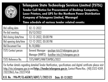 Tender for Desktop Computers, Laser Printers, and UPS for the Northern Power Distribution Company of Telangana Limited, Warangal