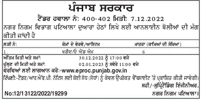 Tender for Details item of works Purchase O&M Municipal Corporation Department Patiala invites online bids for the following is done