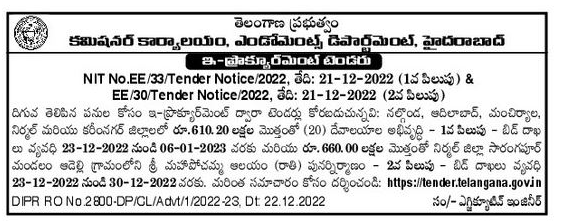Tender for Development of (20) Temples Call for Renovation of Sri Mahapochamma Temple (Stone) at Audelli Village, Sarangapur Mandal, Nirmal District