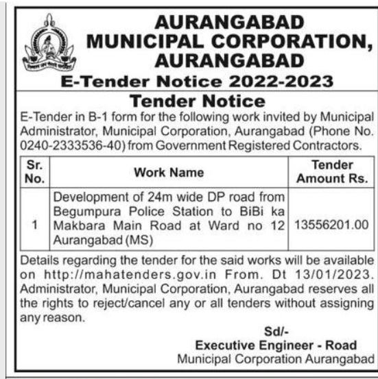 Tender for Development of 24m wide DP road from Begumpura Police Station to BiBi ka Makbara Main Road at Ward no 12 Aurangabad (MS)