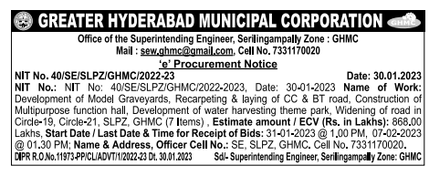 Tender for Development of Model Graveyards, Recarpeting & laying of CC & BT road, Construction of Multipurpose function hall, Development of water harvesting theme park, Widening of road in Circle-19, Circle-21, SLPZ, GHMC (7 Items),