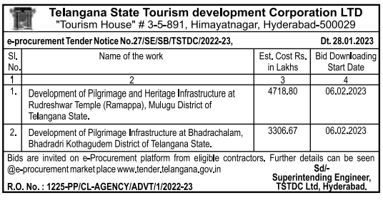 Tender for Development of Pilgrimage Infrastructure at Bhadrachalam, Bhadradri Kothagudem District of Telangana State.