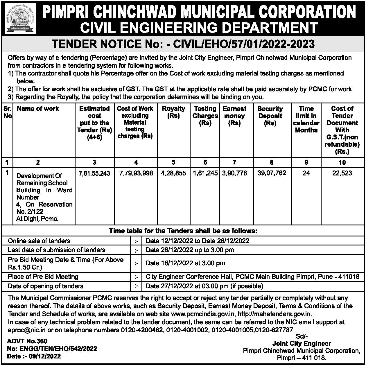 Tender for Development Of Remaining School Building In Ward Number 4, On Reservation No. 2/122 And Dighi, Pcmc.