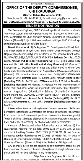 Tender for Development of Road, Parks and other works in Hiriyur CMC limits under Chief Minister’s Amrtuh Nagarothana (Municipality) Scheme
