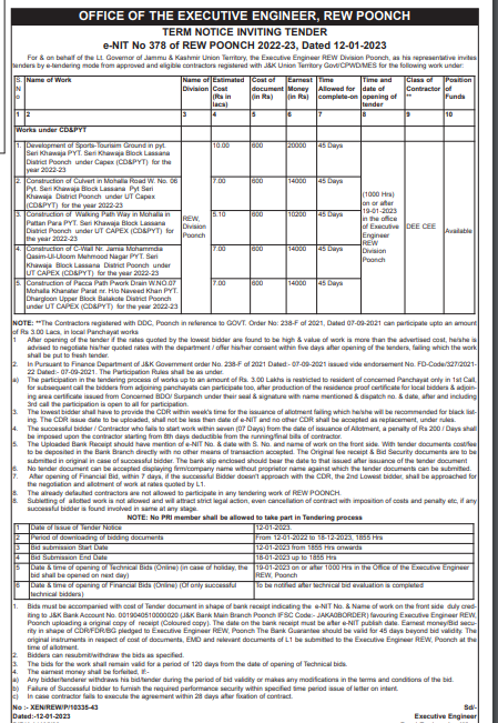Tender for Development of Sports-Tourism Ground in pyt Seri Khawaja PYT.Se Khawaja Block Lassana District Poonch under Capex (CD&PYT) for the year 2022-23
