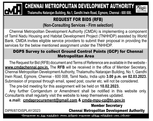 Tender for DGPS Survey to collect Ground Control Points (GCP) for Chennai Metropolitan Area