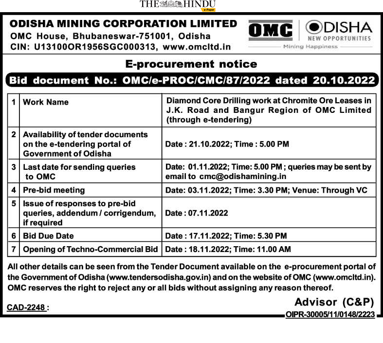 Tender for Diamond Core Drilling work at Chromite Ore Leases in J.K. Road and Bangur Region of OMC Limited (through e-tendering)