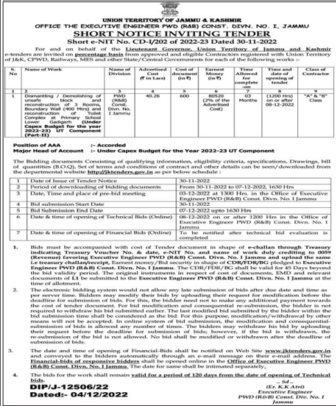 Tender for Dismantling / Demolishing of reconstruction of 3 Rooms, Boundary Wall (400 Mtrs) and Toilet Complex at Primary School Lower Gadigarh (Under Capex Budget for the year 2022-23) UT Component