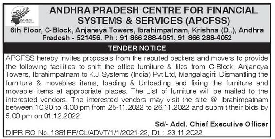 Tender for Dismantling the furniture & movables items, loading & Unloading and fixing the furniture and movable items at appropriate places.