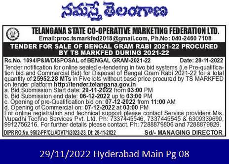 Tender for Disposal of Bengal Gram Rabi 2021-22 for a total quantity of 25952.28 MTs in Five lots without base price procured by TS MARKFED