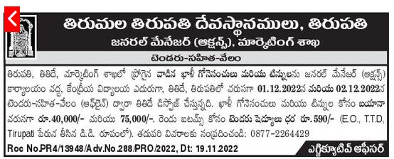Disposing of Tithe through Tender – Sahitya-Auction (Offline). Bayana for empty sacks and tins is Rs.40,000/- and Rs.75,000/- respectively.