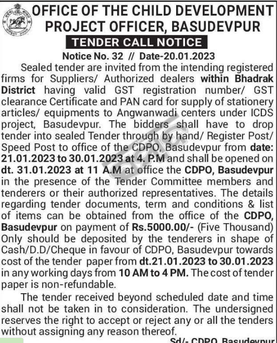 Tender for District having valid GST registration number/ GST clearance Certificate and PAN card for supply of stationery articles/ equipments to Angwanwadi centers under ICDS project, Basudevpur.