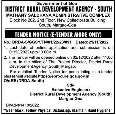 Tender for DISTRICT RURAL DEVELOPMENT AGENCY – SOUTH MATHANY SALDHANA ADMINISTRATIVE COMPLEX Block No 202, 2nd Floor, New Collectorate Building South, Margao-Goa TENDER NOTICE (E-TENDER MODE ONLY) No.: DRDA-S/GGSY/TN/01/22-23/091