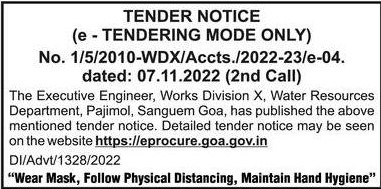 Tender for Division X, Water Resources Department, Pajimol, Sanguem Goa, has published the above mentioned tender notice.