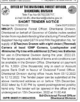 Tender for Divisional Forest Officer Dhenkanal Division Dhenkanel on behalf of Governor of Odisha invites sealed tender from reputed intending Manufacturing Firms Dealer Supplier having valid GSTIN and PAN Registration No. for supply of 2Twoines Drones with night vision (Thermal) Camera at least 12MP Camera, Loudspeaker