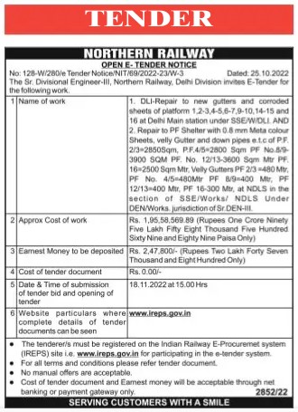 Tender for DLI-Repair to new gutters and corroded sheets of platform 1.2-3,4-5,6-7,9-10,14-15 and 16 at Delhi Main station under SSE/WOLL